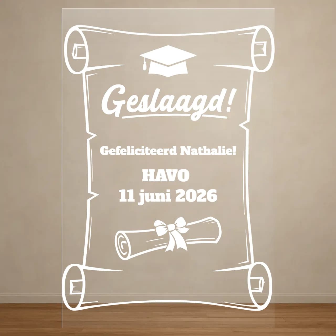 Vier het moment van geslaagd zijn met dit stijlvolle bedrukte plexiglas plaat. Volledig te personaliseren met naam, niveau en datum! Een perfect en blijvend cadeau om dit bijzondere succes te herinneren! 🎓✨