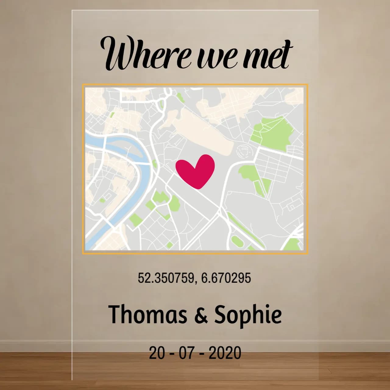 Verras je geliefde met deze stijlvolle bedrukte plexiglasplaat. Volledig te personaliseren met je eigen foto, namen, adres en datum! Een perfect en blijvend cadeau om mooie momenten te herinneren.